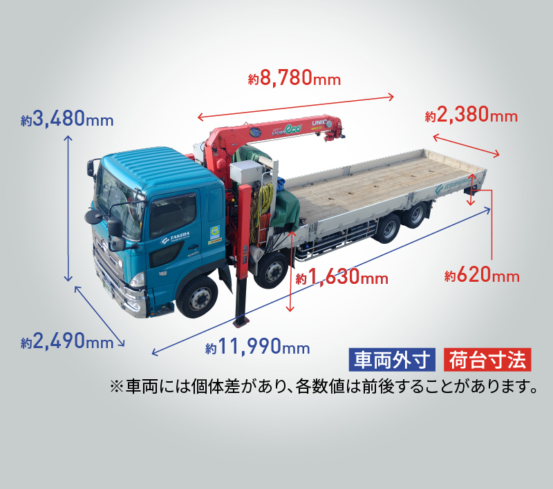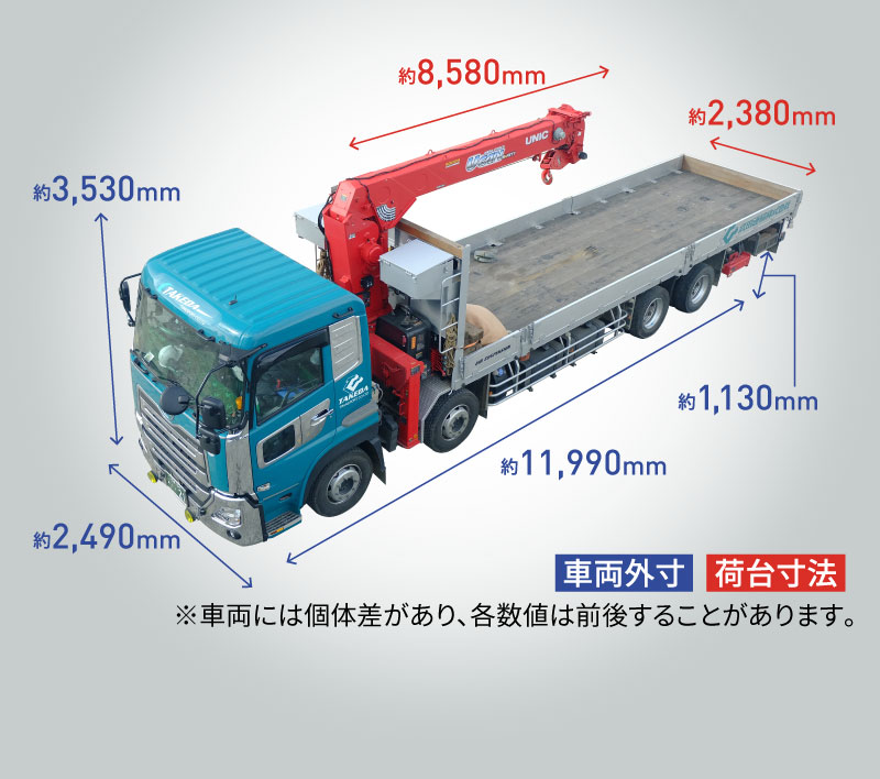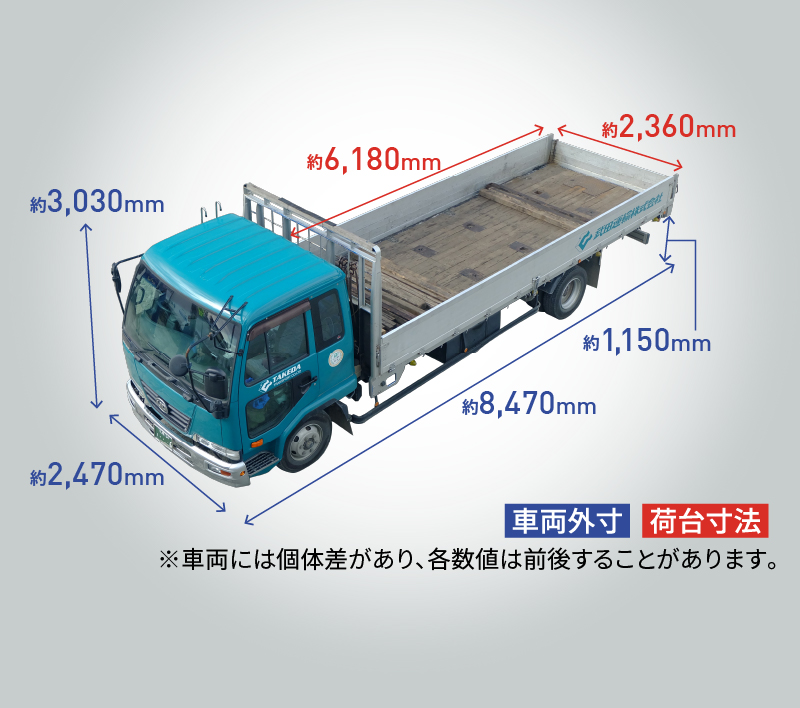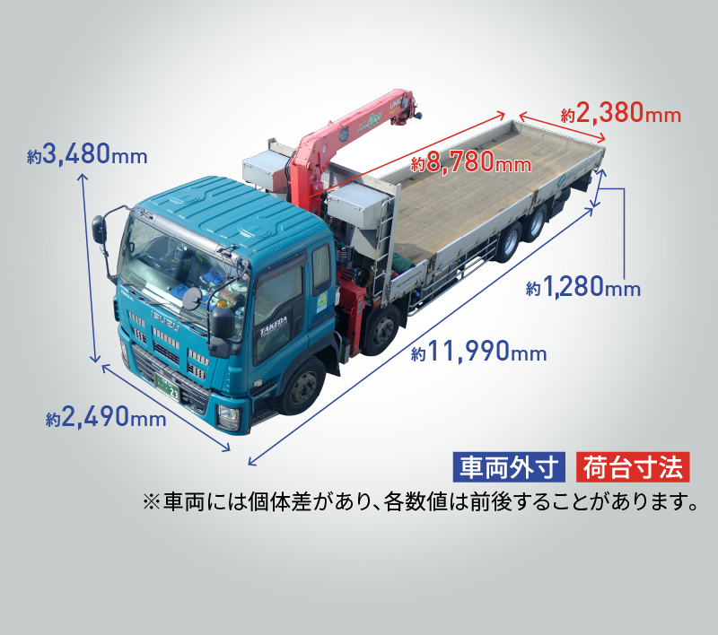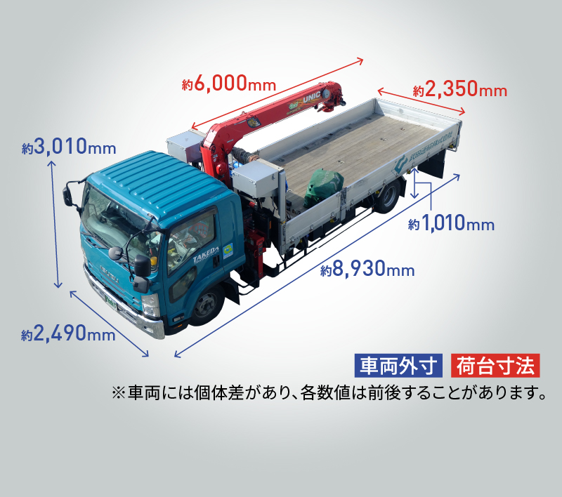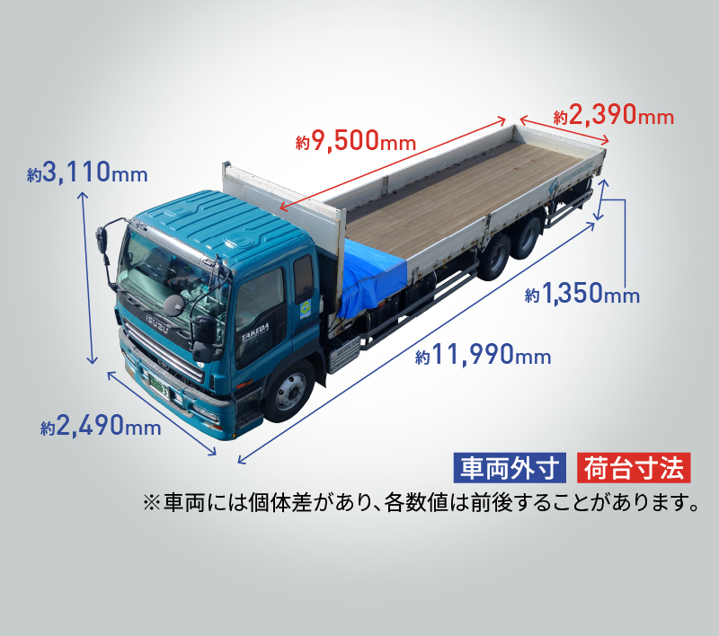 クレーンを搭載しないことで荷台長を長くとることができ、クレーン付き車よりも多く荷物を運ぶことができます。小回りの利く2tから、ゆとりある11tまで幅広く揃えております。